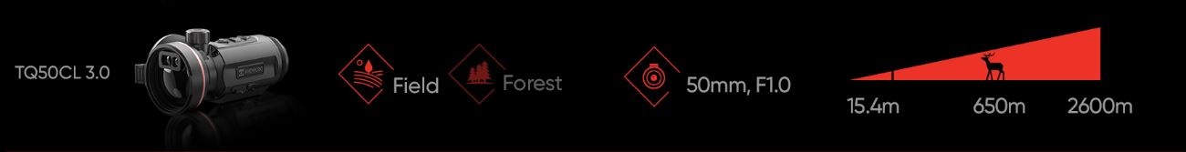 De TQ50CL is voorzien van een afstandsmeter die verwerkt is in het lensoppervlakte van de Thunder 3.0. Met een 50mm lens en een detectie range tot wel 2600 meter is de TQ50CL geschikt voor grote jachtvelden.